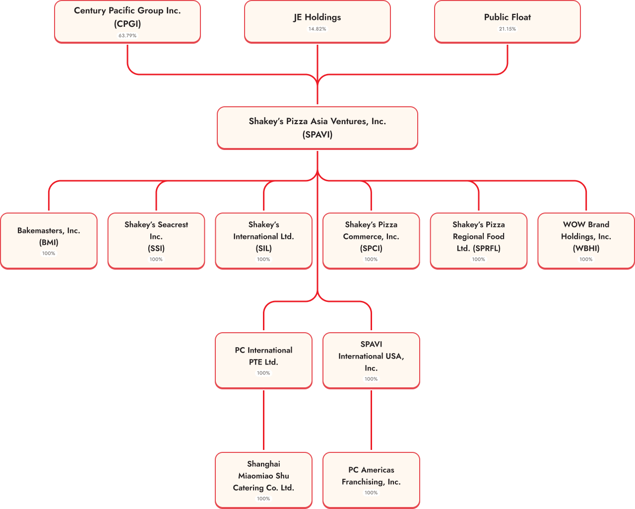 On April 1, 2016, Shakey's Asia Food Holdings, Inc. (SAFHI), a company owned by Century Pacific Group, Inc. (CPGI), Arran Investments Private Limited (AIPL), and the Prieto family, acquired 100% interest in PIZZA. SAFHI then transferred its ownership in PIZZA to CPGI, AIPL, and the Prieto family on October 5, 2016.
